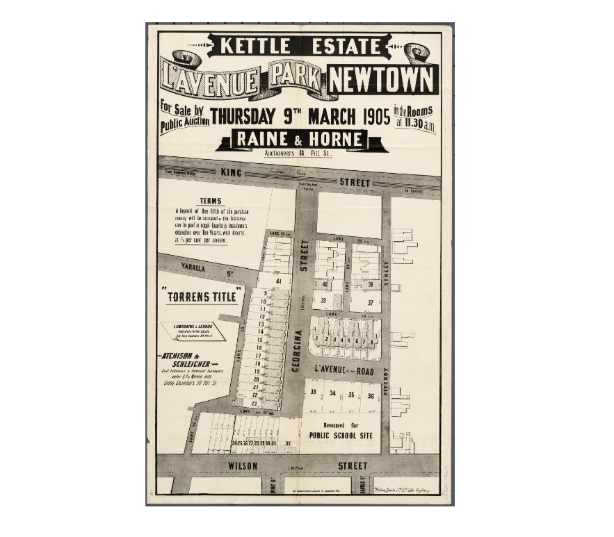 Inspired by Sydney History Week 2021 theme “from the ground up”, this project aims to showcase the patchwork of people and events that have made this location what it is today – a place for community gathering. Through historical images, genealogy records, and other documents sourced from the Sydney City Archives we explore the history of Hollis Park on Warren Ball Avenue (formerly known as L’Avenue) in Newtown, Australia. Once part of the Kettle Estate, remnants of the gate that previously bordered the estate can still be found at the top of Georgina street and on Fitzroy street.